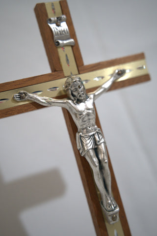 Wood Standing Crucifix with metal inlaid diamond cut strips with metal corpus.
