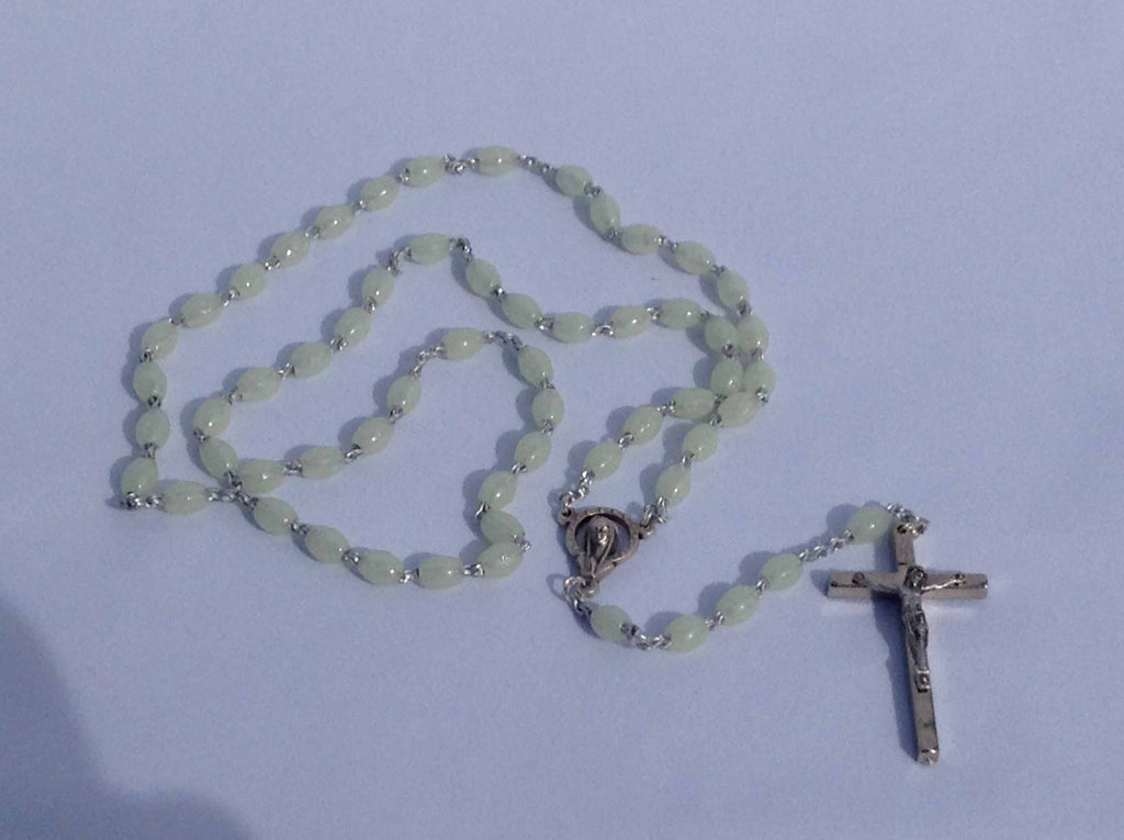plastic glow in the dark rosary. Metal centerpiece and crucifix.