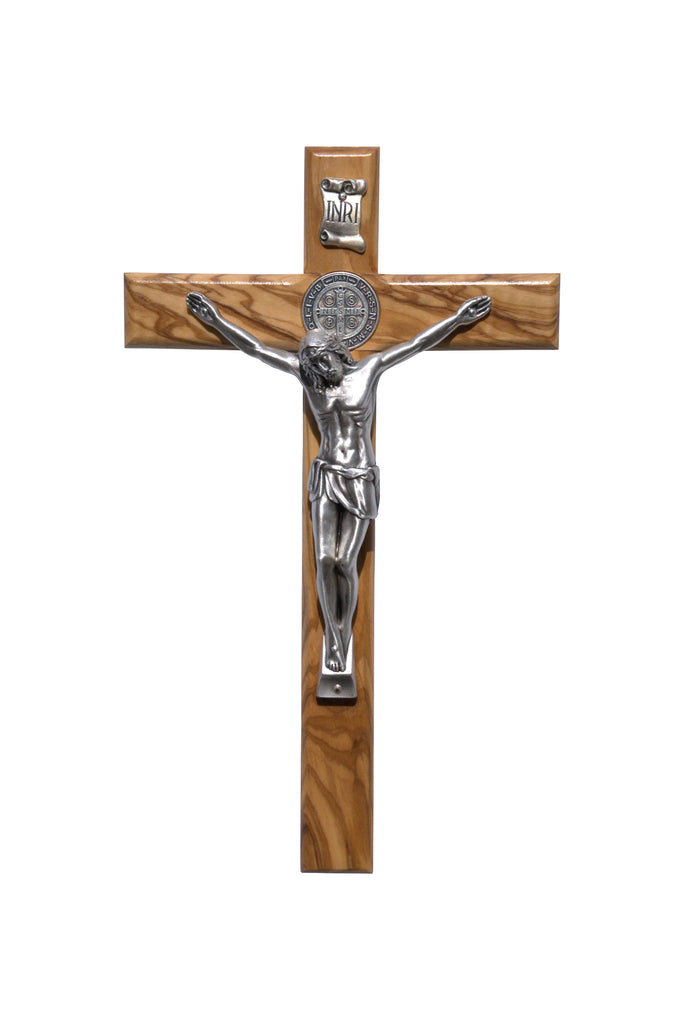 Olive Wood St. Benedict Wall Crucifix with oxidised silver plated Corpus - 30 x 18cm. A good size for bedroom wall.